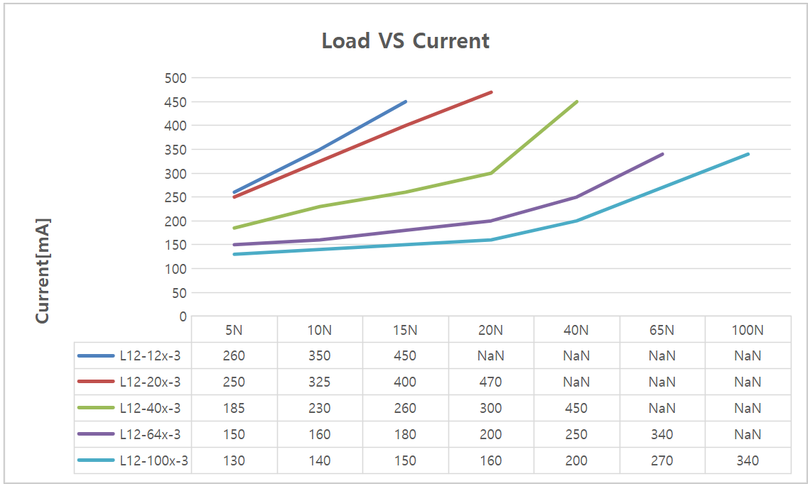 입력 전압에 따른 Stall Force를 측정한 Data입니다. 해당 Data는 오차를 포함하고 있음으로 참고로 사용하시면 됩니다.
